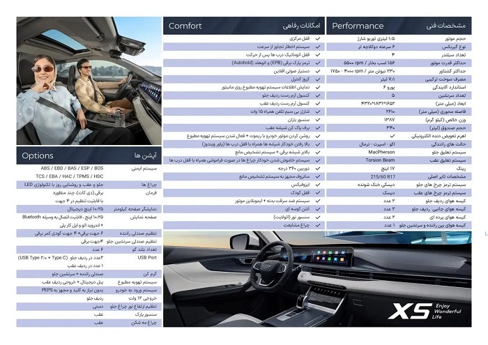 - 7 کیسه هوا: 2 کیسه هوا سرنشینان جلو + 2 کیسه هوای پردهای + 2 کیسه هوای جانبی سرنشینان جلو و کیسه هوای میانی