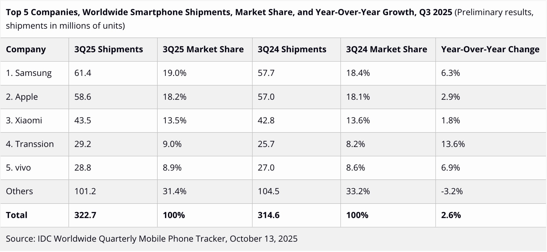 در همین دوره، اپل با ۵۸.۶ میلیون دستگاه آیفون و ۱۸.۲ درصد سهم بازار، در رتبه دوم قرار گرفت. شیائومی (Xiaomi) با ۴۳.۵ میلیون، ترنشن (Transsion) با ۲۹.۲ میلیون و ویوو (Vivo) با ۲۸.۹ میلیون دستگاه (۸.۹ درصد سهم) به ترتیب در ردههای بعدی بازار گوشی هوشمند جهانی ایستادند.