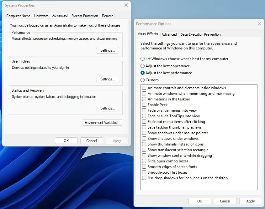 برای بهبود پاسخگویی رابط کاربری در سیستمهای با سختافزار ضعیفتر، میتوانید جلوههای ویژه بصری را غیرفعال کنید. با اجرای sysdm.cpl و رفتن به System Properties > Advanced > Performance > Settings، گزینه Adjust for best performance یا Custom را برای انتخاب جلوههای مورد نظر خود انتخاب کنید.