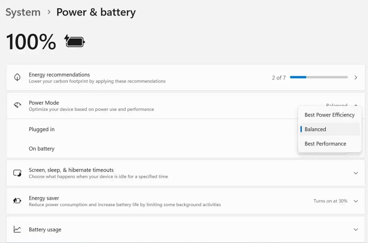 در Settings > System > Power & battery > Power Mode، حالت Best Performance را برای حداکثر کارایی انتخاب کنید. برای لپتاپها، هنگام عدم اتصال به برق، حالت Balanced یا Best power efficiency را تنظیم کنید.